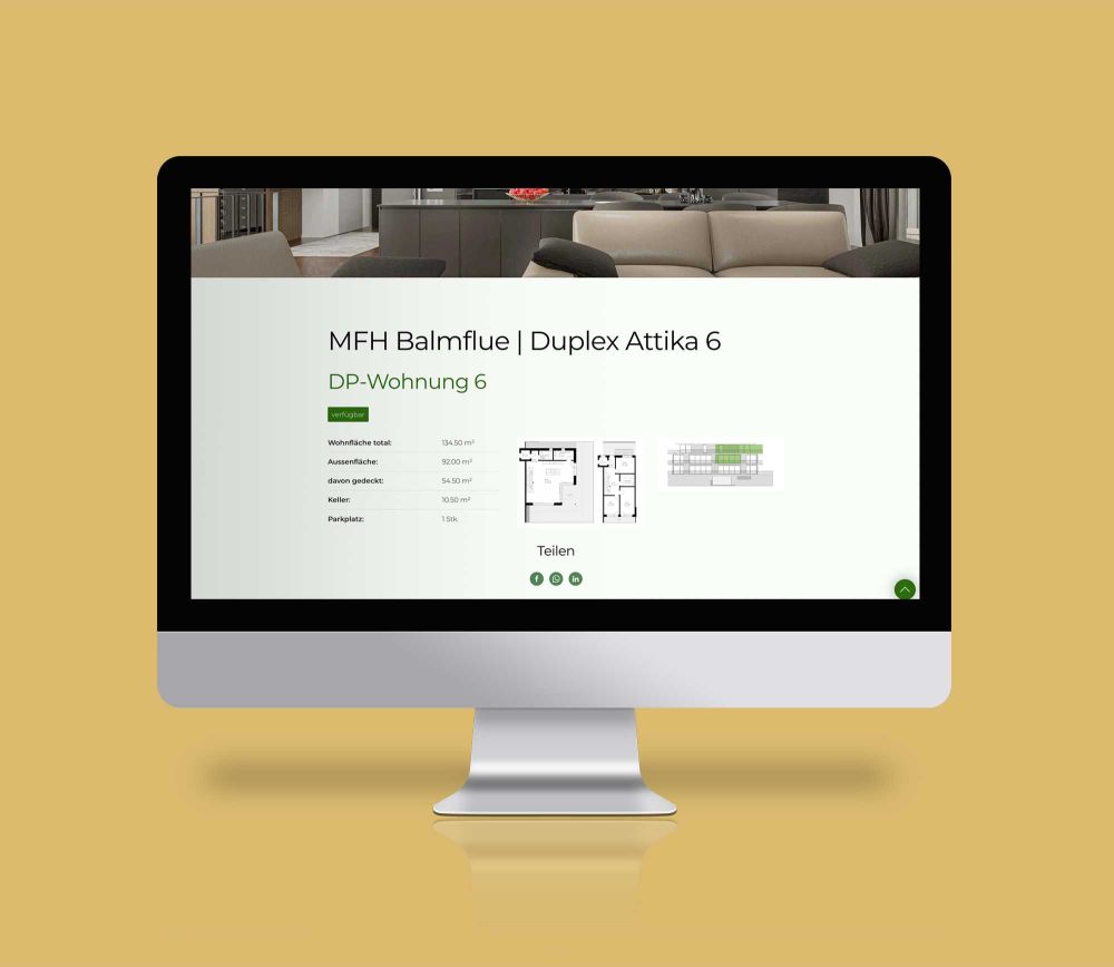 Für die Bauherrschaft, die Beatus + Co. GmbH in Luterbach, durfte Mosaiq den Webauftritt entwickeln und umsetzen, aber auch Begleitmassnahmen zur Vermarktung dieser Eigentumswohnungen. Dazu gehörte die grafische Adaption von bestehenden Unterlagen, die Strukturierung und Benutzerführung auf der Website, Textarbeiten sowie die Erstellung von Kleinanzeigen und Bautafeln. Mit unserer Erfahrung im Bau- und Immobilienmarkt konnten wir die Kundenanforderungen gezielt abholen. Der Wohnungsspiegel und die Blog-Seite informieren immer aktuell über der Verkaufsstatus und über den Baufortschritt.